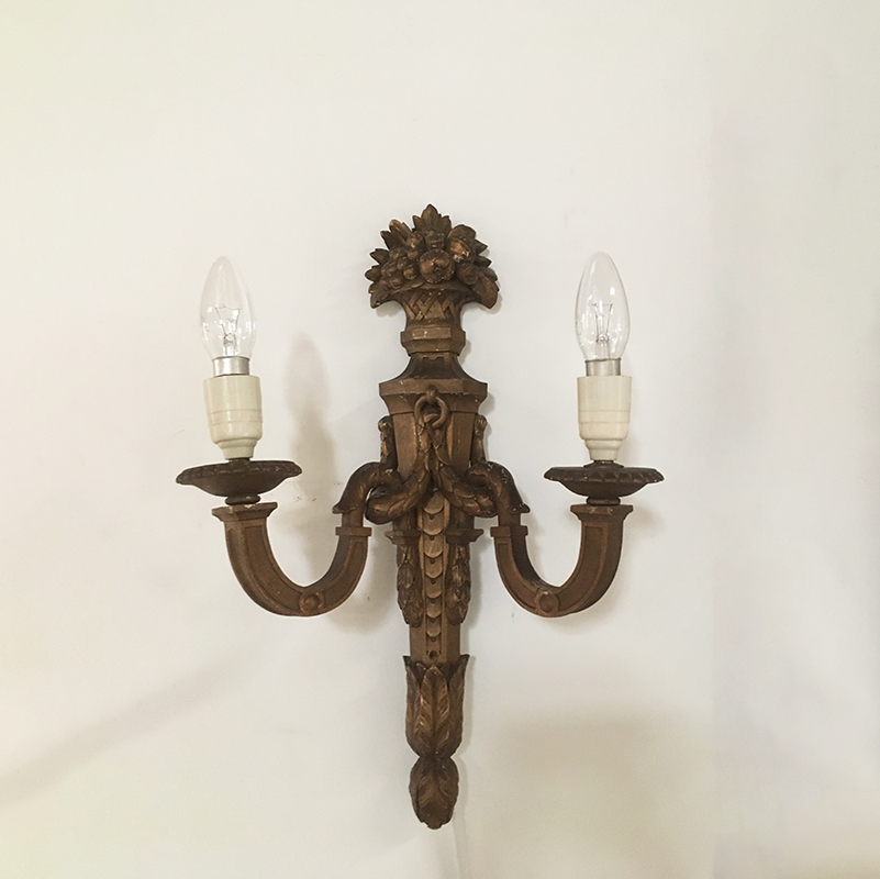 A pretty pair of French 1930's Louis 16 style giltwood sconces. Beautifully carved decoration including floral baskets and wreathes. Priced as a pair.