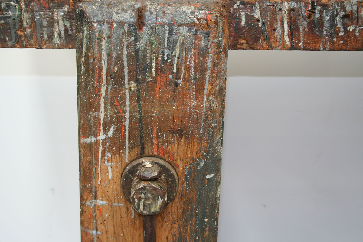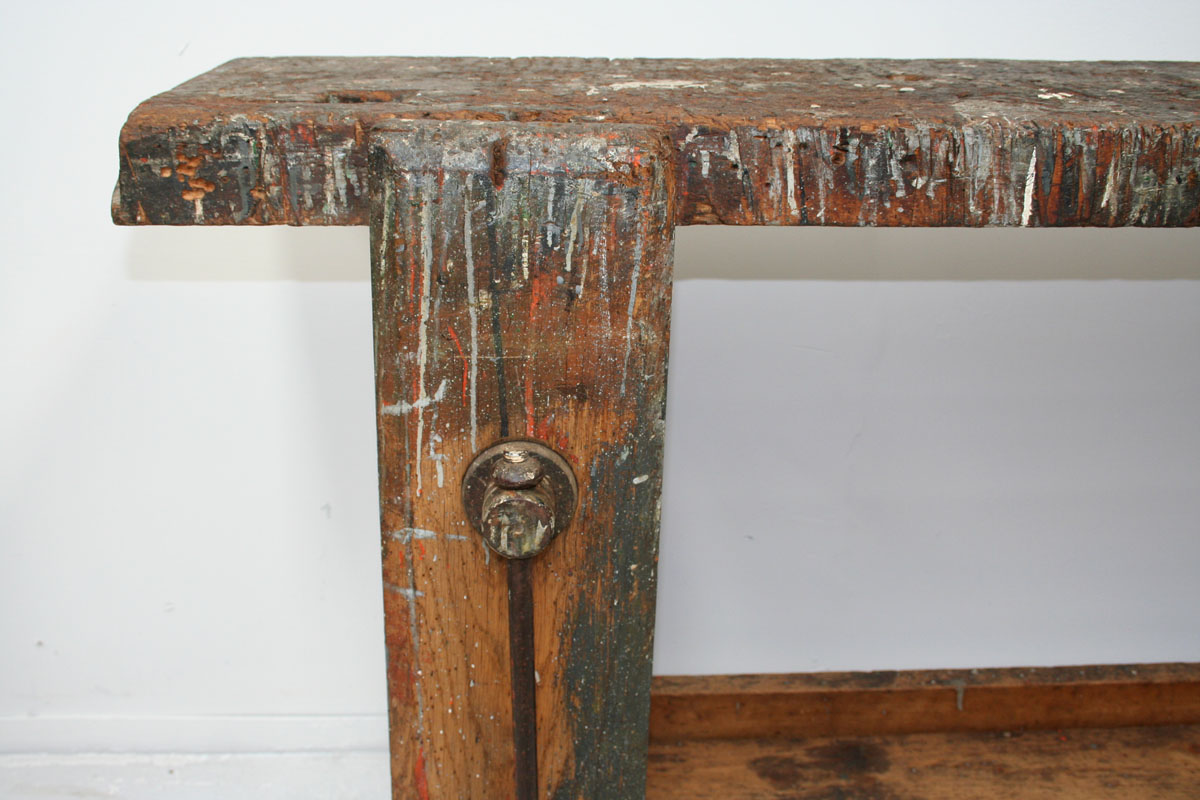 A charming French early 20th century workbench of petite proportions. This lovely little table has a rustic sculptural quality. It has enjoyed life in an artist's studio with paint still in evidence on the bench adding character and decorative appeal. The table would be the perfect dimensions for use as a hallway table or perhaps a small sofa table .