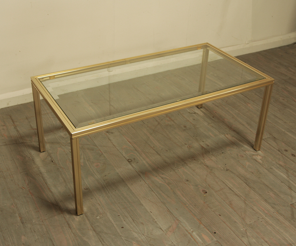 A vintage, 20th century, Pierre Vandel coffee table. Brass plating over aluminium and bevelled glass top. Signed Pierre Vandel Paris.