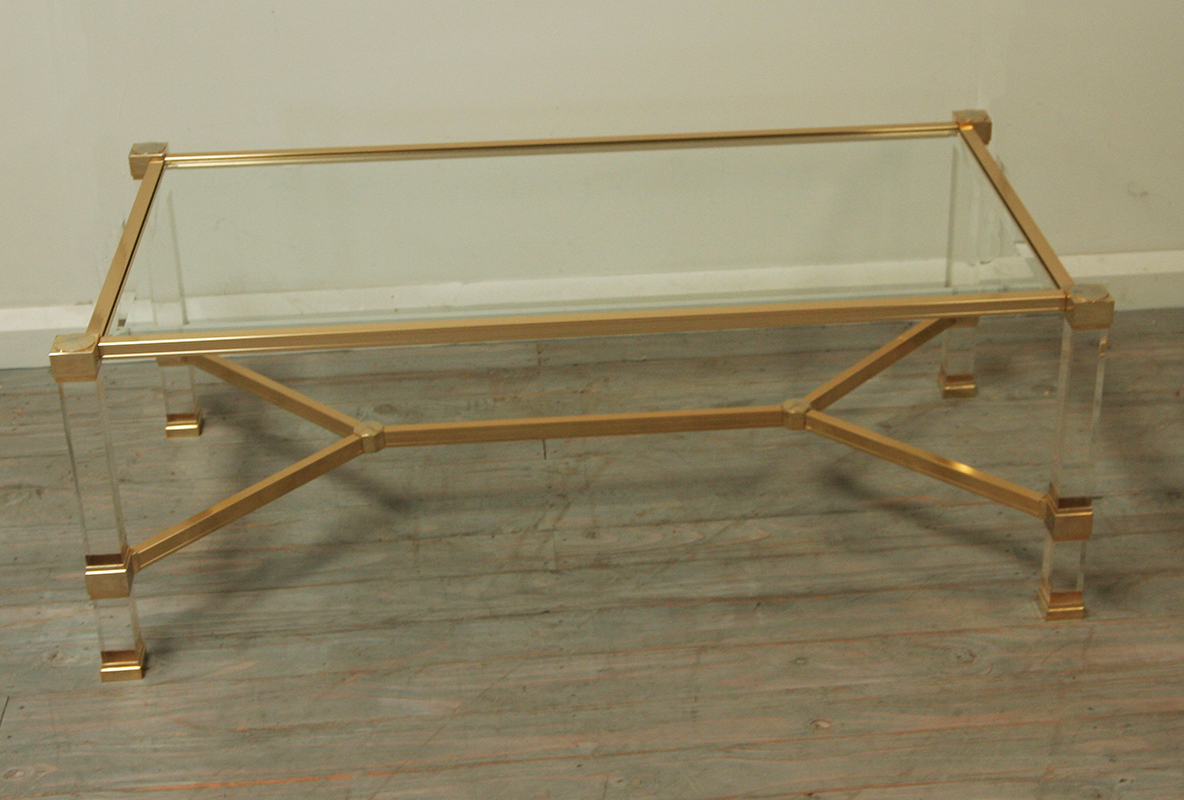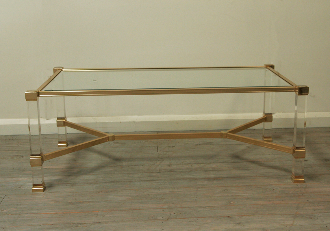 A vintage Pierre Vandel coffee table - lucite, brass and glass with an unusual stretcher base.