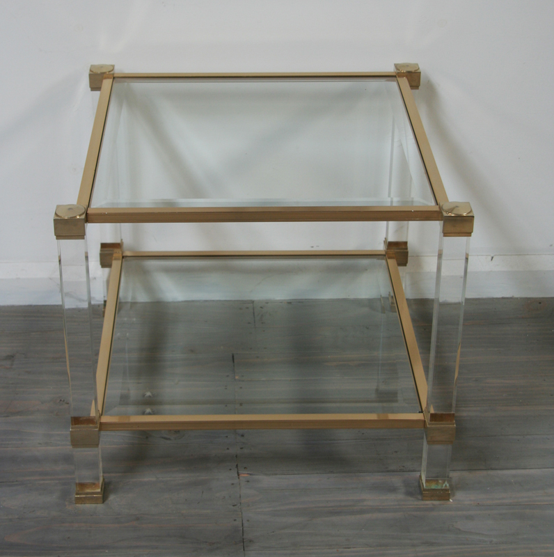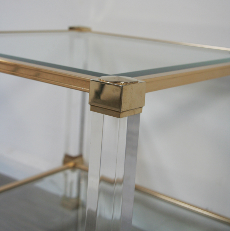 A very stylish lucite, brass and glass side table designed by Pierre Vandel, Paris. This very chic side table dates from circa 1970 and oozes French 20th century glamour. Maker's plaque attached.