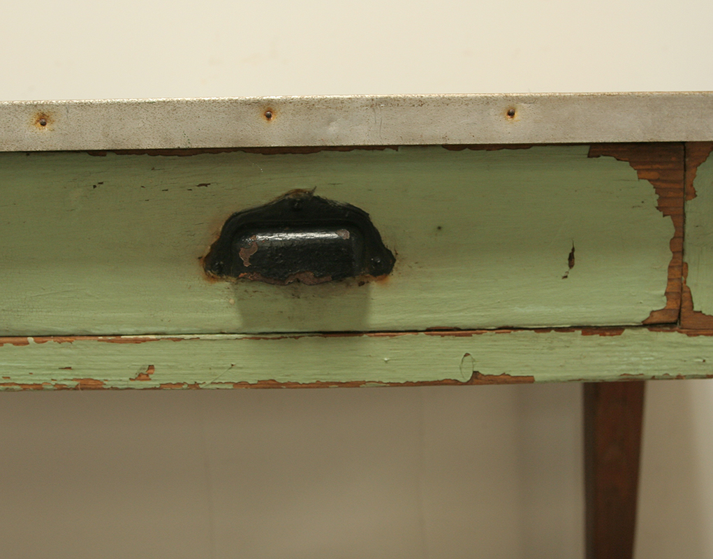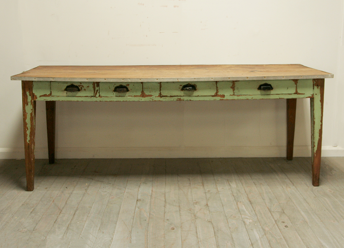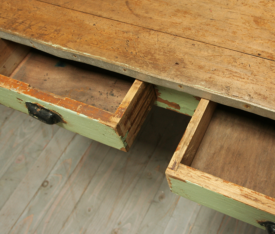 A charming and decorative, rustic painted table from a florist shop in the Loire region of France. The table is made from pine and has traces of the original green paint on the front - it dates from the early 20th century. This table would make a fun and functional dining table but also looks stunning against a wall as a display table.