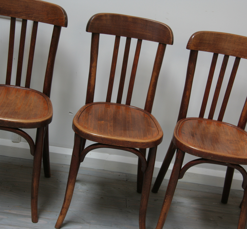 A set of 4 French, mid 20th century, circa 1950, Baumann café chairs. These are a wonderful example of the much loved ubiquitous and utilitarian French bentwood bistrot chair and would bring that French casual café charm to any dining setting.