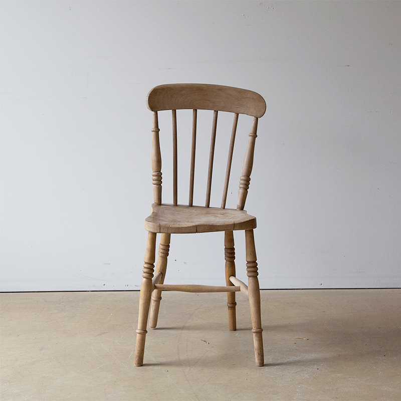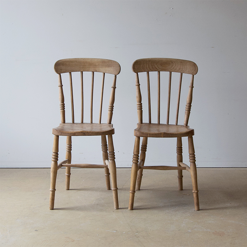 A charming set of four, bleached elm, English, provincial dining chairs. Dating from the late 19th century and crafted by hand, these delightful chairs are all slightly different, some are quaintly skewed and the wood is gently burnished by time. These characterful chairs are still strong and serviceable - a great addition to a kitchen table or dining setting.