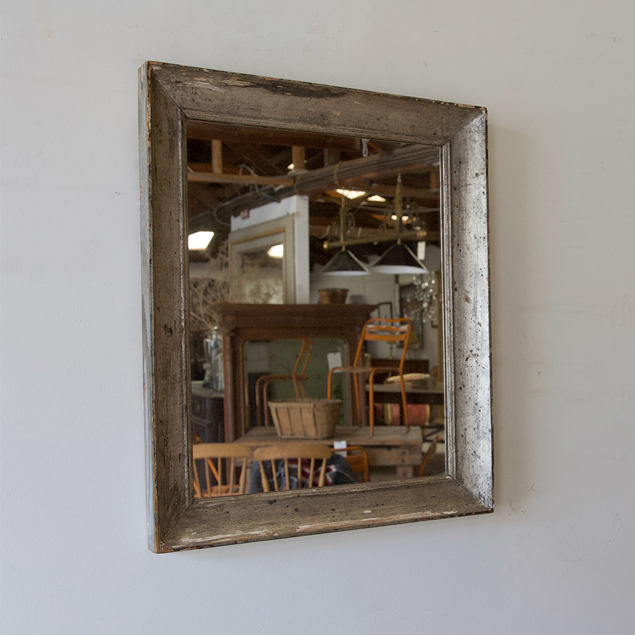 A charming, petite, French 19th century silver gilt mirror with newer glass. A lovely little mirror for a bedroom or bathroom.
