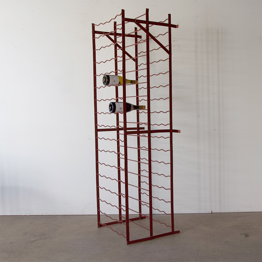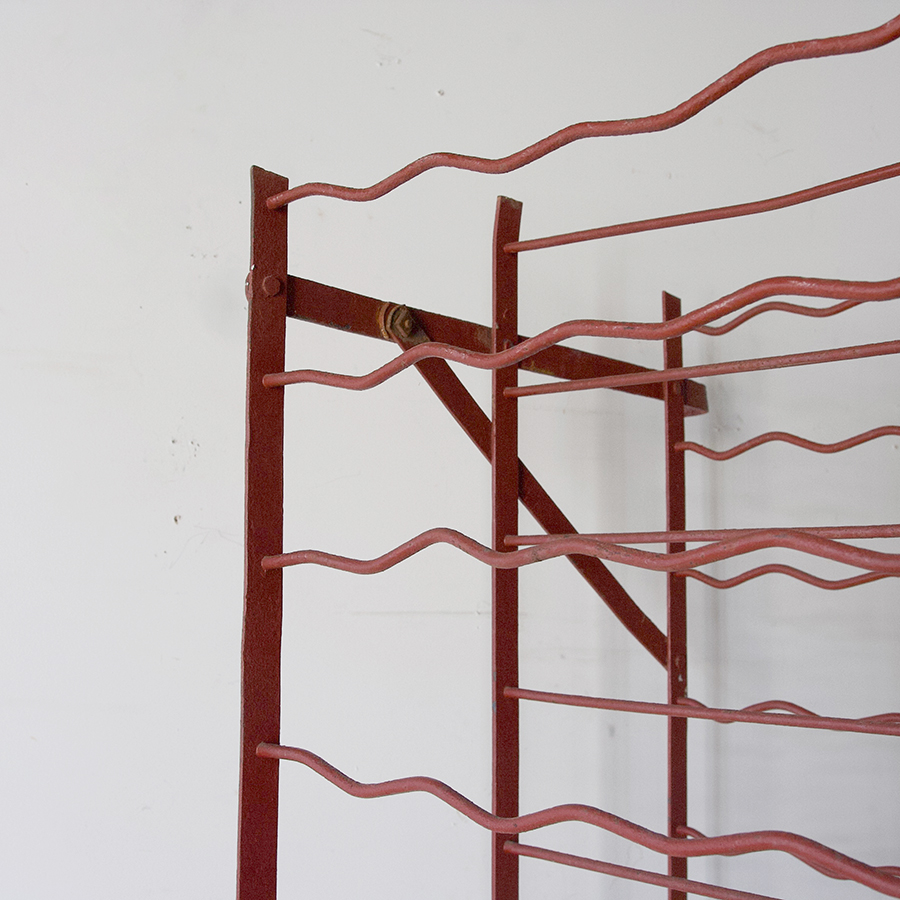 A French vintage, iron, wine rack with charming original brick red painted finish - great compact dimensions yet holds 170 bottles of wine. Iron brackets screw to the wall for support. A wonderful addition to a wine lover's kitchen or cellar.