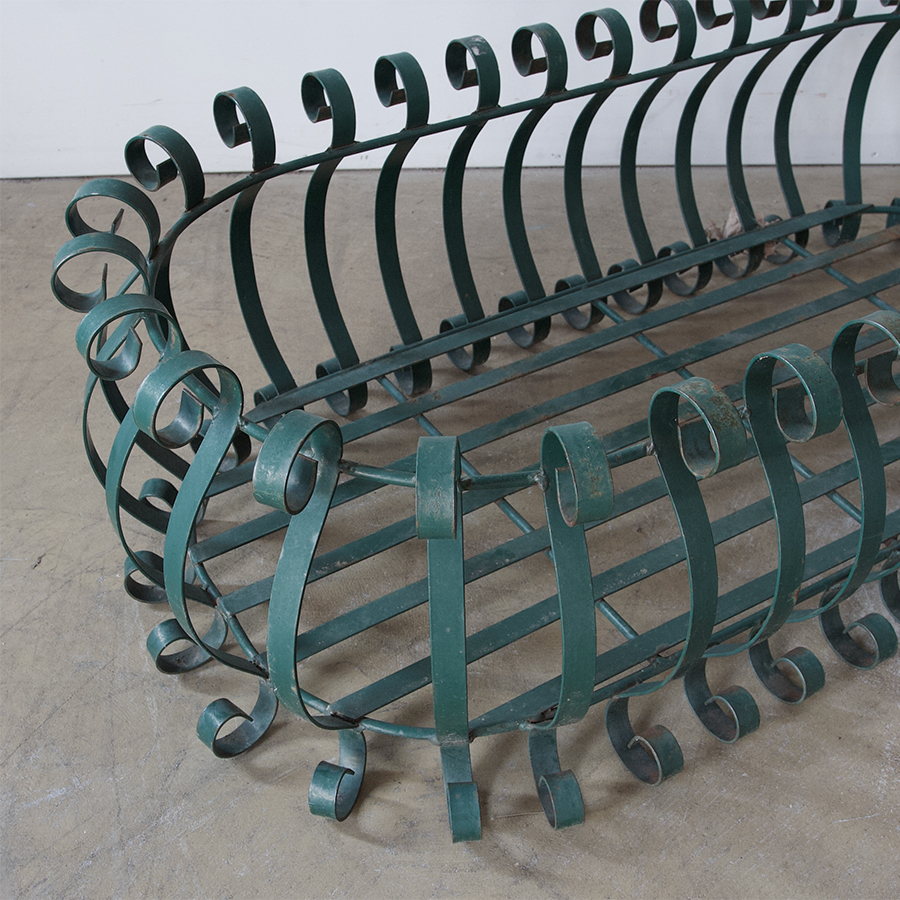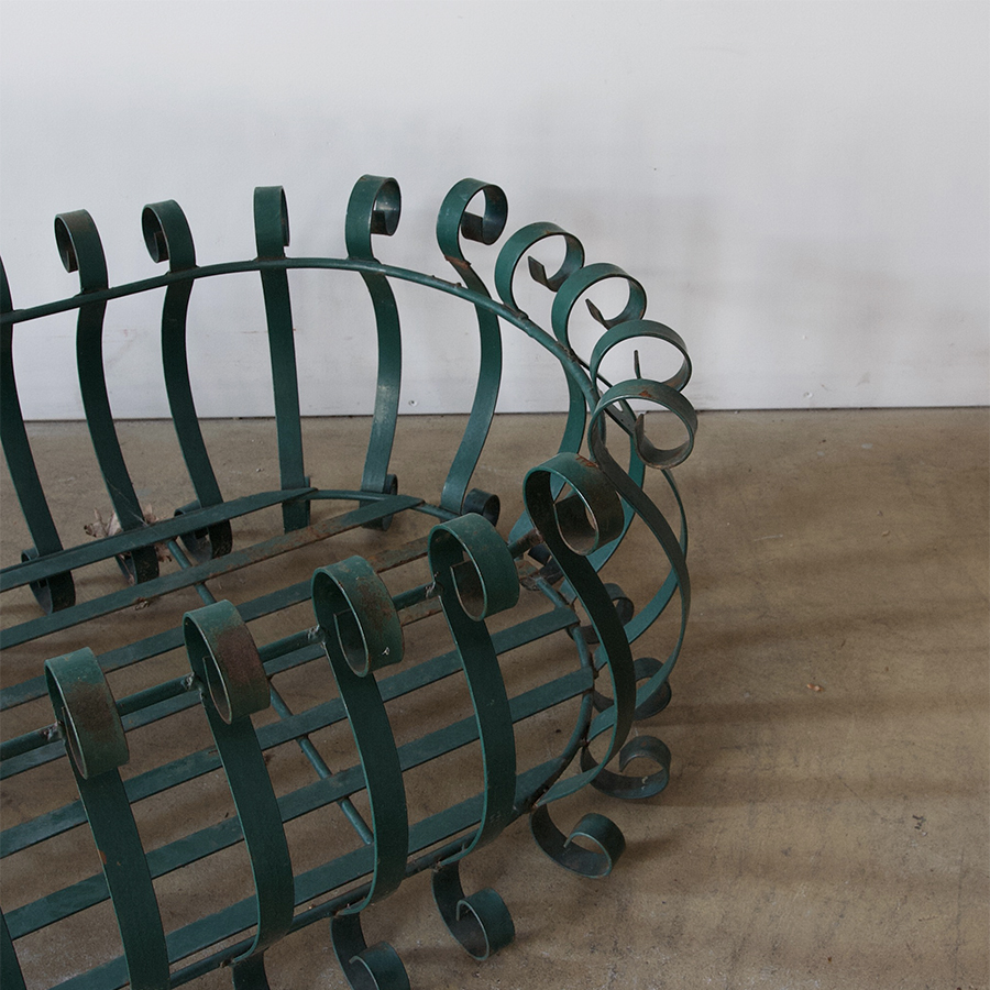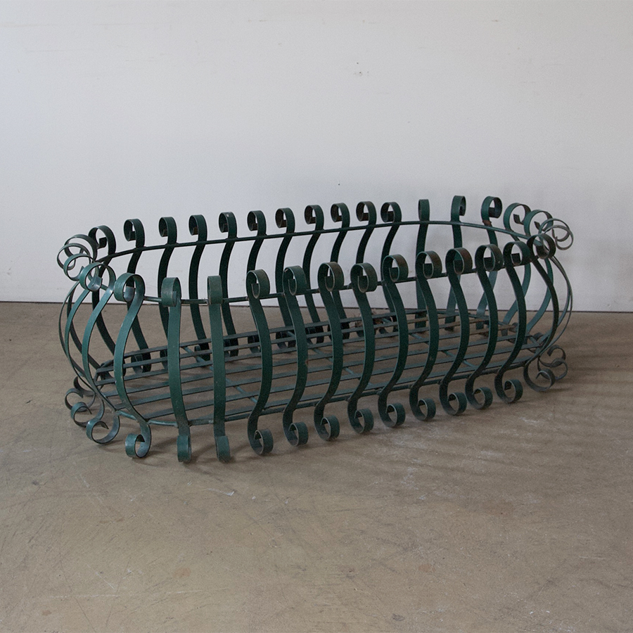 A beautifully decorative, vintage, wrought iron planter with gorgeous green painted finish.